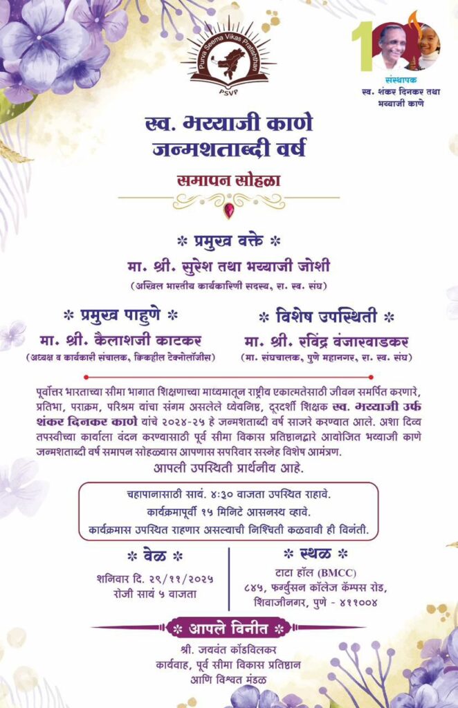 पुणे, दि. २४ नोव्हेंबर : पूर्वोत्तर भारताच्या राष्ट्रीय एकात्मतेसाठी जीवन समर्पित करणारे राष्ट्रीय स्वयंसेवक संघाचे ज्येष्ठ कार्यकर्ते दिवंगत भैय्याजी काणे यांच्या जन्मशताब्दी वर्षाची सांगता २९ नोव्हेंबरला (शनिवारी) होत आहे. राष्ट्रीय स्वयंसेवक संघाचे अखिल भारतीय कार्यकारिणी सदस्य सुरेश तथा भैय्याजी जोशी यावेळी उपस्थित राहणार आहेत. बीएमसीसी महाविद्यालयाच्या टाटा सभागृहात सायंकाळी ५ वाजता हा कार्यक्रम होईल. अशी माहिती पूर्व सीमा विकास प्रतिष्ठानचे कार्यवाह जयवंत कोंडविलकर यांनी दिली.