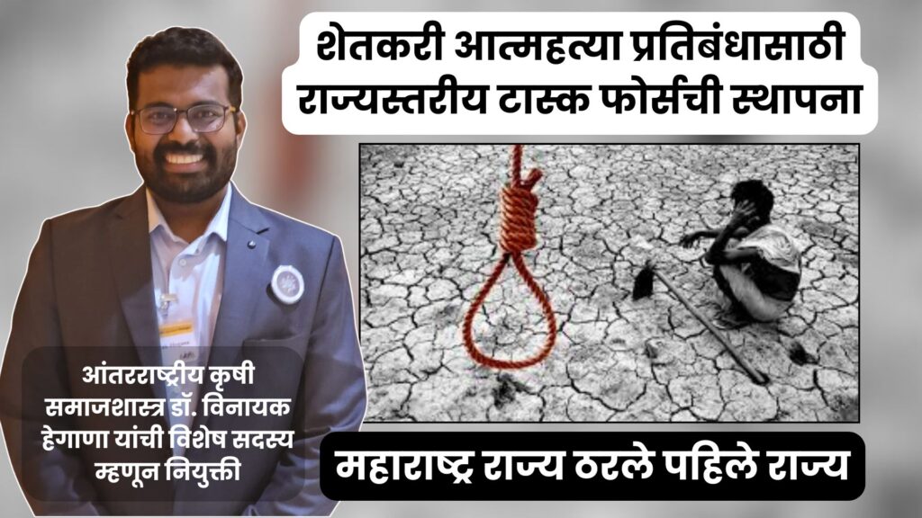 पुणे, दि. १८ फेब्रुवारी : राज्यातील शेतकरी आत्महत्या रोखण्यासाठी तसेच हवामान बदलामुळे निर्माण होणाऱ्या आपत्तींच्या पार्श्वभूमीवर शेतकऱ्यांच्या मानसिक, सामाजिक व आर्थिक समस्यांवर प्रभावी उपाययोजना राबवण्यासाठी महाराष्ट्र शासनाने कृषी विभागांतर्गत राज्यस्तरीय टास्क फोर्स स्थापन करण्याचा निर्णय घेतला आहे. या टास्क फोर्सवर शेतकऱ्यांच्या मानसिक आरोग्य क्षेत्रात मागील दहा वर्षांपासून कार्यरत असलेले कृषी धोरणातील तज्ञ संशोधक, कृषी समाजशास्त्र डॉ. विनायक हेगाणा यांची विशेष सदस्य म्हणून नियुक्ती करण्यात आली आहे.